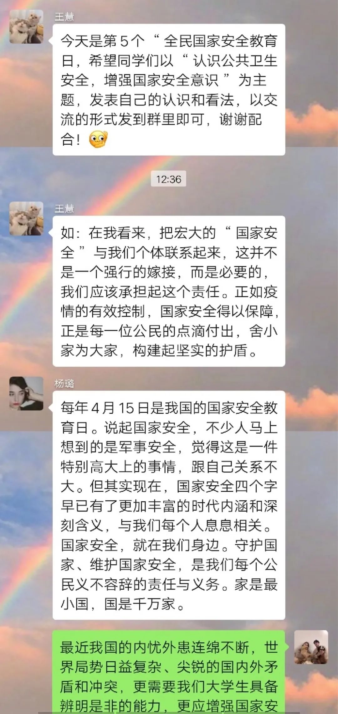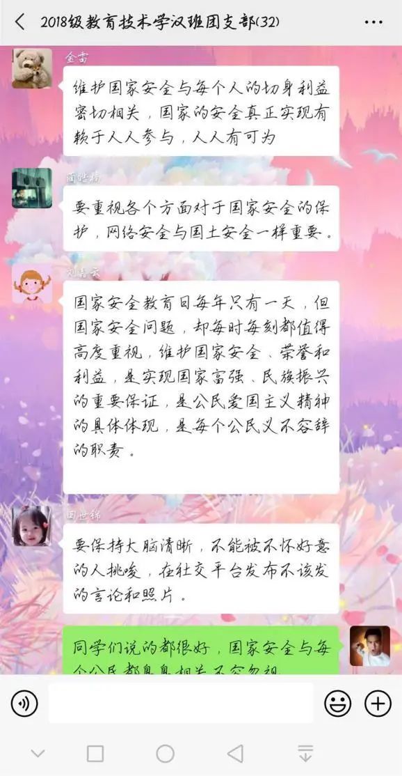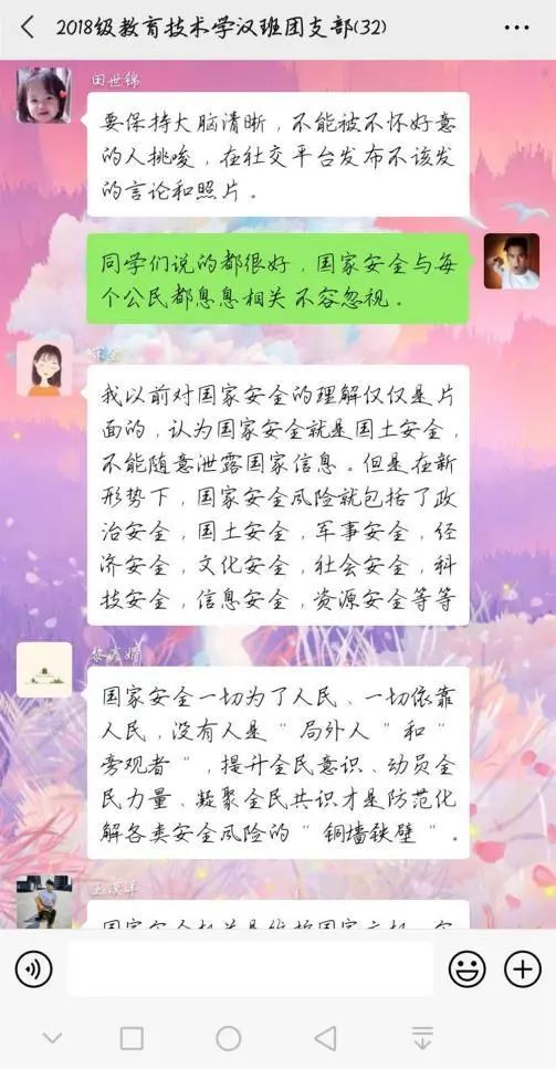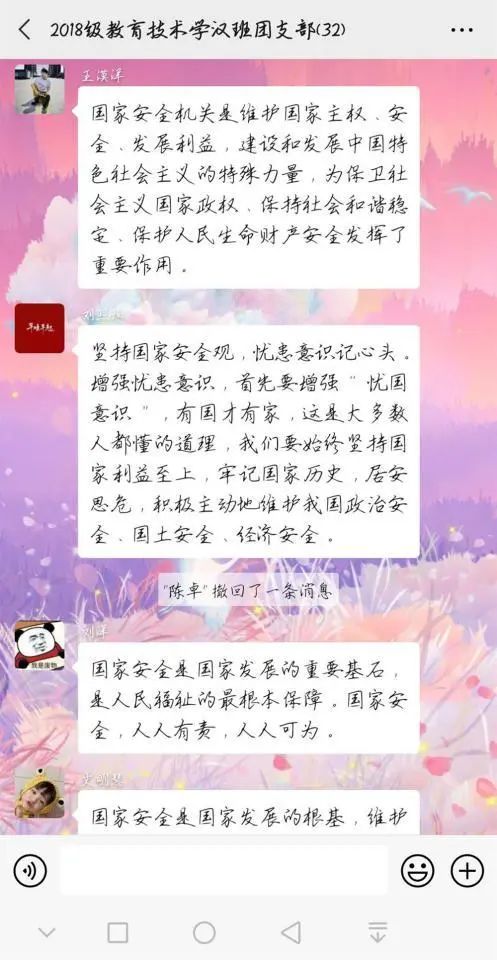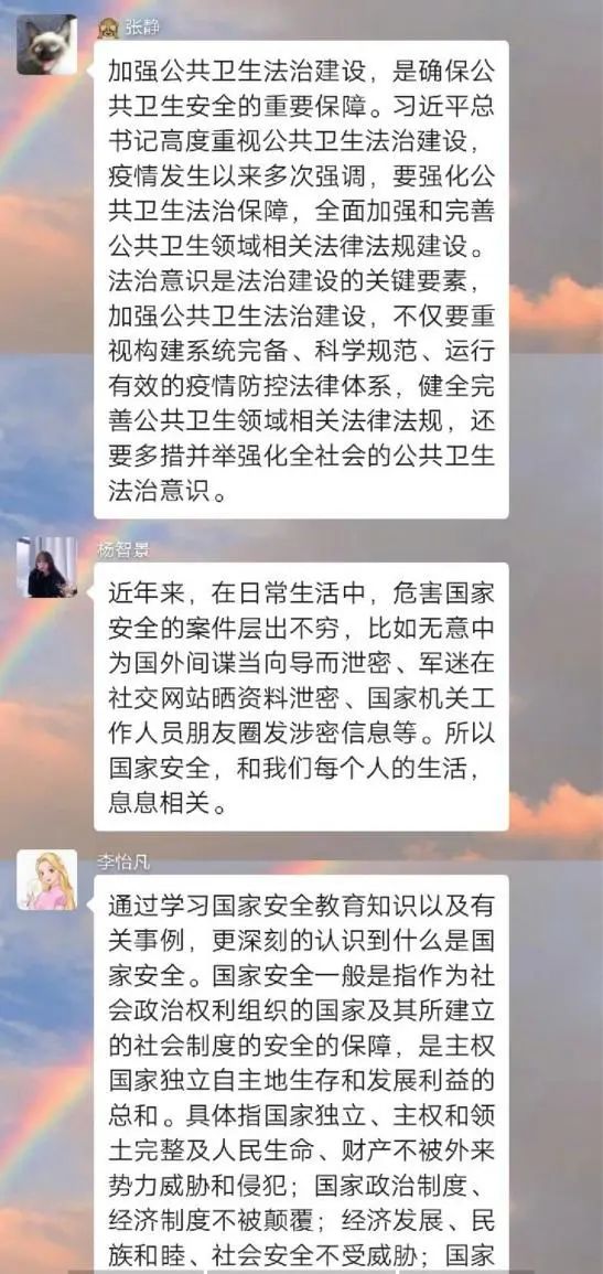 为深入学习贯彻以习近平同志为核心的党中央关于疫情防控工作的决策部署,引导员工将总体国家安全观贯穿抗疫全过程,履行应对突发公共事件的职责义务,提升维护国家安全的自觉性和主动性,m88登录入口官网各团支部举办以“深入认识公共卫生安全,增强国家安全意识”为主题的团日活动。通过线上交流、分享心得的方式,加强同学们对国家安全的认识,使国家安全教育深入到每个人心中。