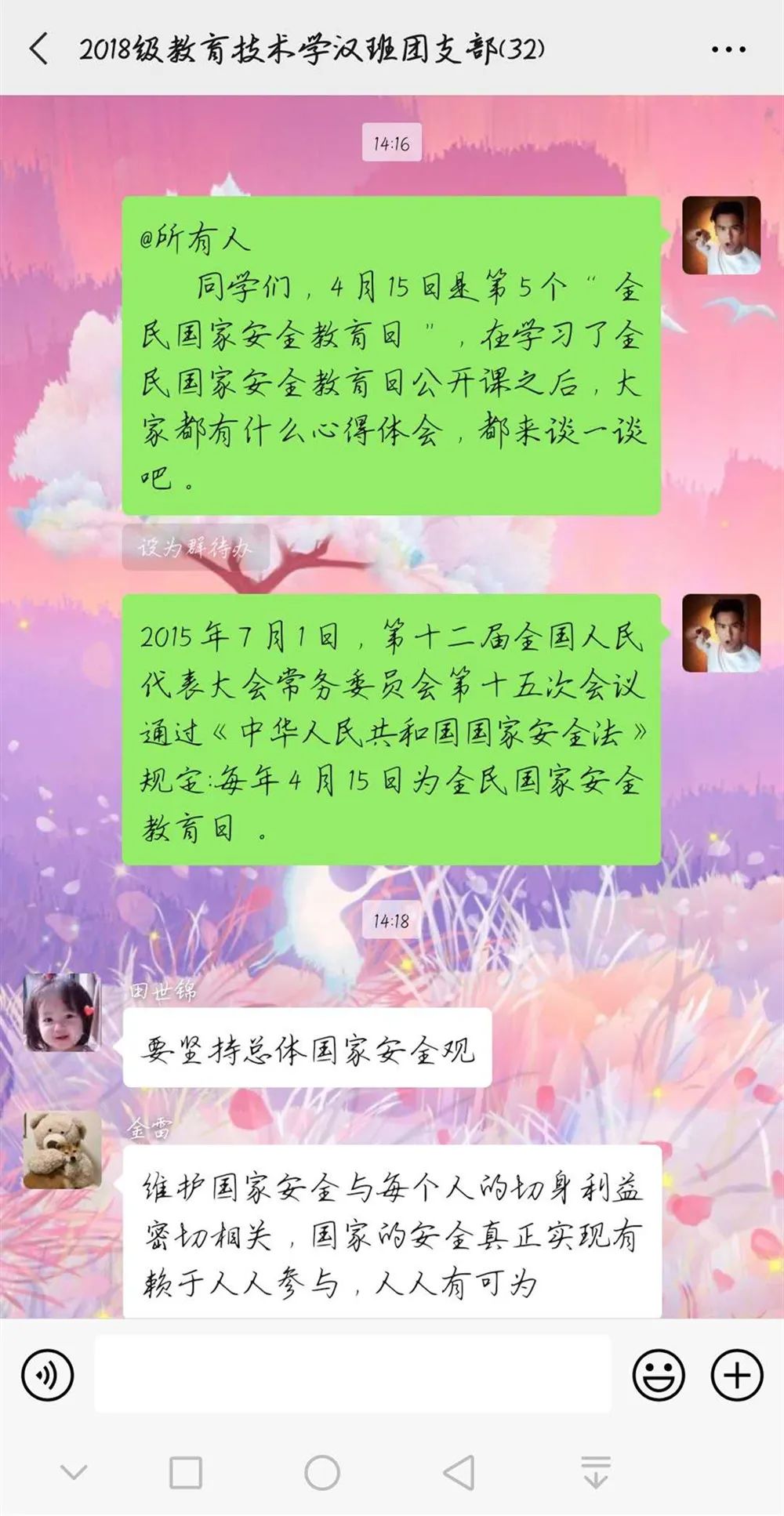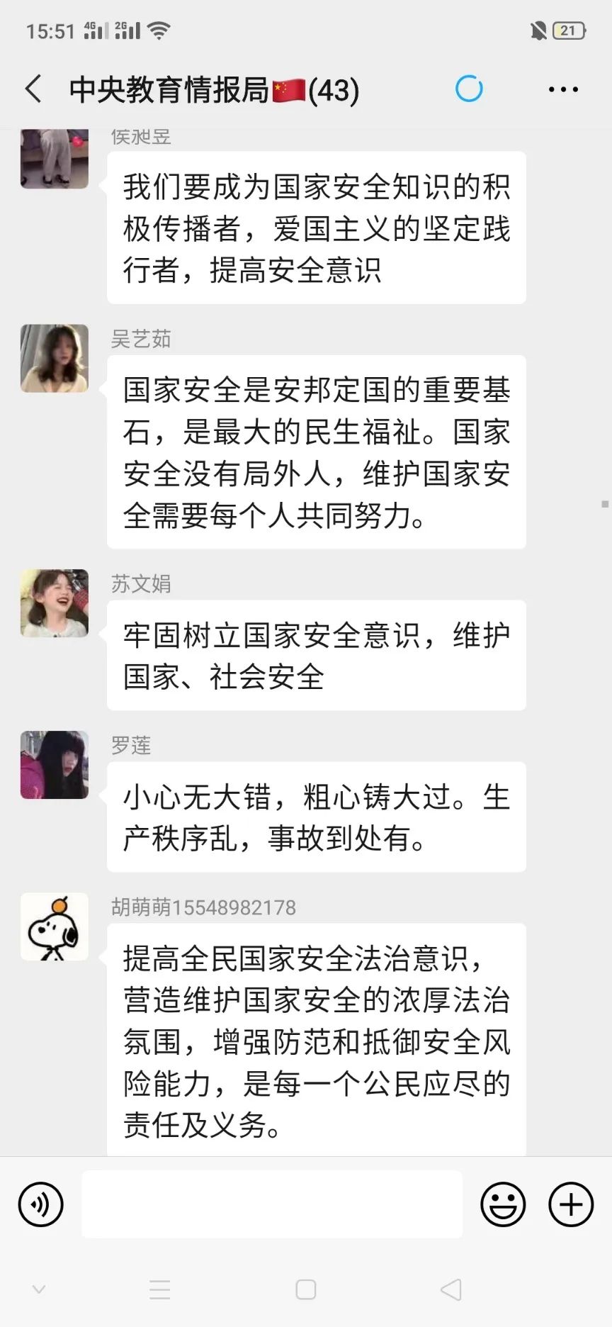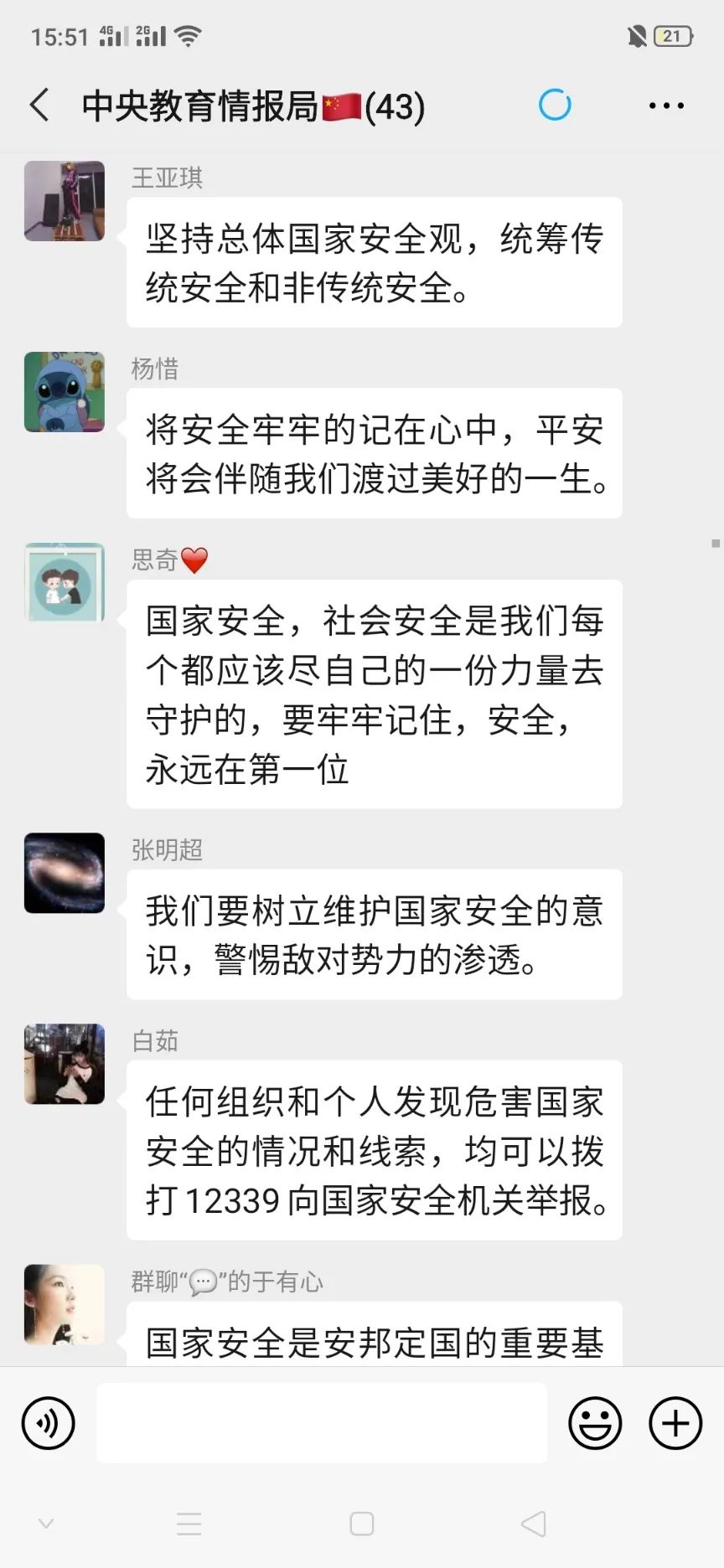 此次的团日活动,让我们意识到维护国家安全, 人人都是主角,国家安全不仅仅是国家的责任,更是我们每一个青年的责任。我们也应该为国家安全而努力,不断提高国家安全法治宣传的影响力和传播力!