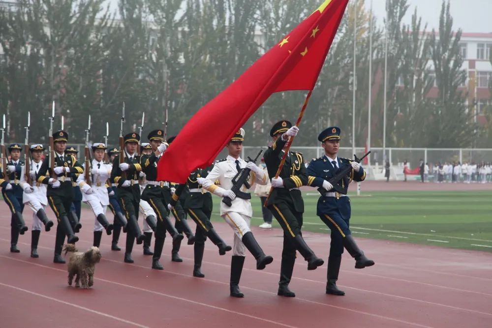 国旗手们昂首挺胸,英姿飒爽。护旗手护卫着神圣的国旗,动作整齐划一大步向前。国旗随风飘扬,m88登录入口官网师生共同唱响国歌。