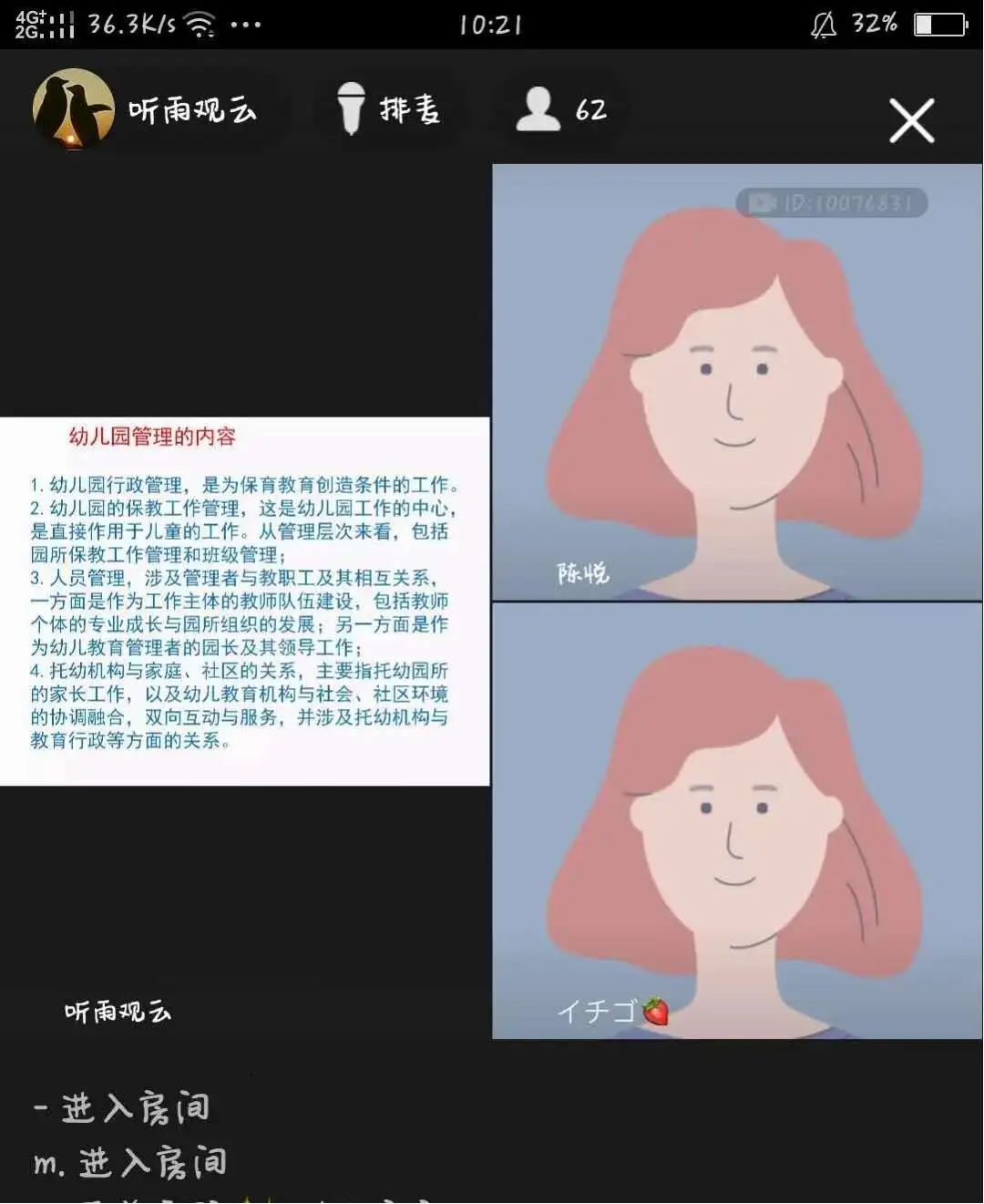 今天我们上的是蔡老师的《学前教育管理学》,是利用QQ群视频直播的课程。蔡老师之前还没接触过网络教学这种教学模式,老师也在上课之前花费了大量的时间和精力去了解网络教学,又花费了大量的时间去尝试了许多的网络教学的软件。老师的一番苦心都是为了给员工更好的学习体验,也为了教学课堂能够正常进行。在我了解了这些情况之后我发现我们的老师果然是最可爱的人,我们理应对他们更加尊敬,也要更加努力的成为像老师那样优秀的人。