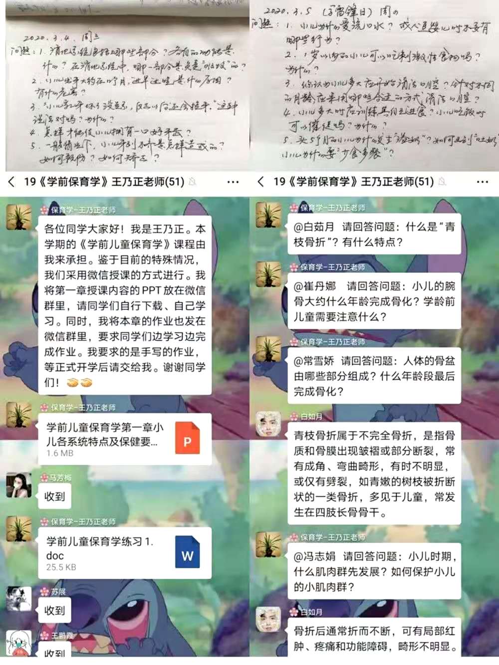 任课老师们每日工作繁忙,现在新增的线上教学更是增加了老师们的工作负担。每天下午三点老师会准时在群内开展教学活动,虽是在家线上开展教学,王老师每次都很准时,我们很感谢老师的认真负责。