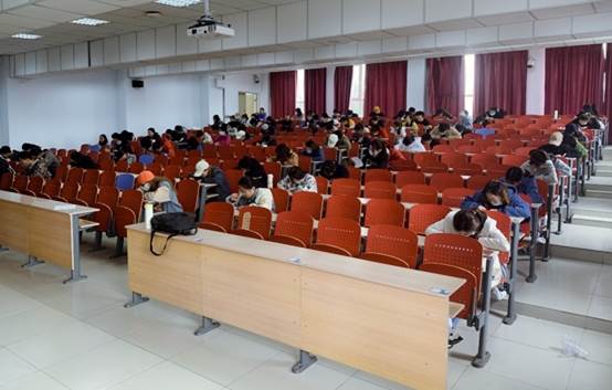 粉笔字考试在多媒体教室进行,员工在教室黑板书写,候场区抽取考试题目,按序进入考场,书写抽到题目,现场评分,每组5人,考试时间5分钟。