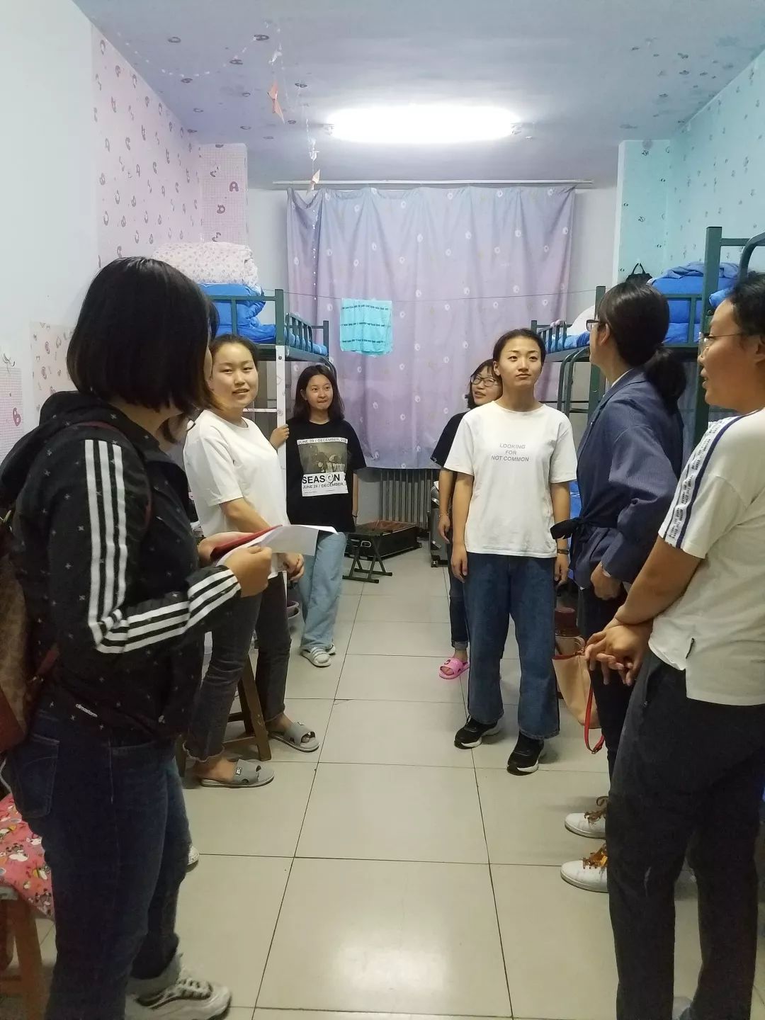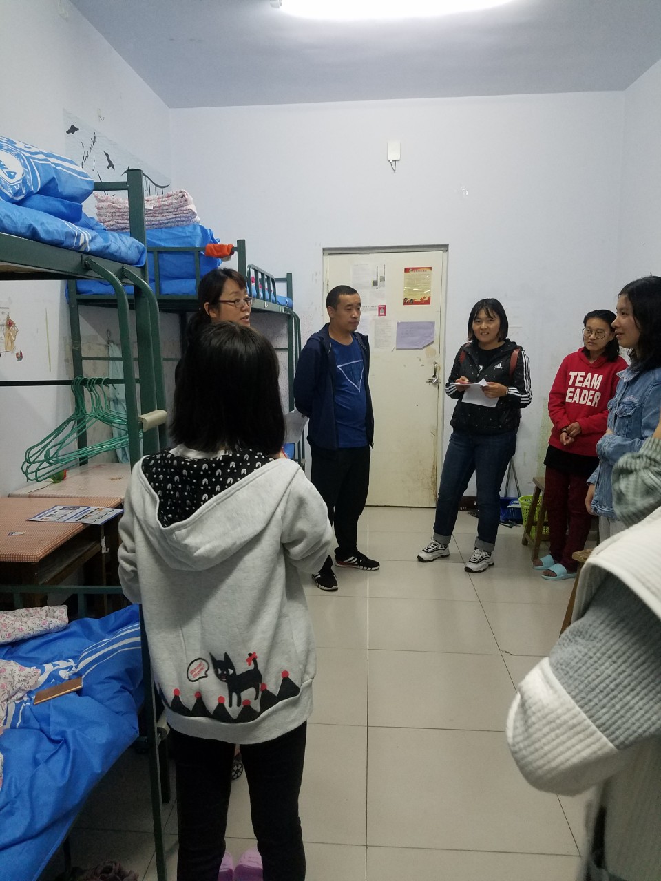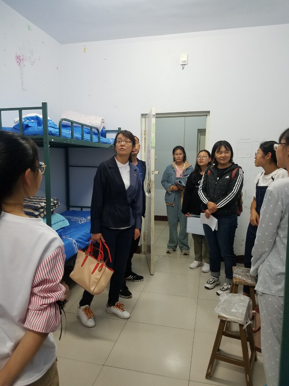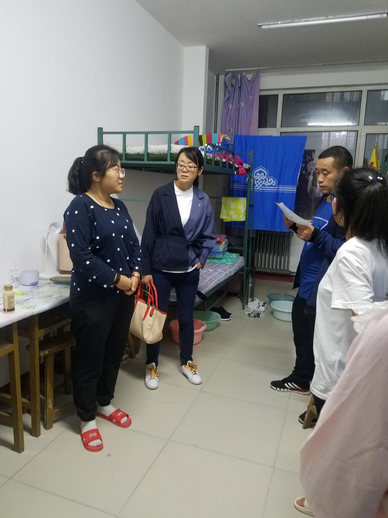m88登录入口官网党委副书记兼副院长王利教授,学工办于国佳老师、团总支孙悦老师、辅导员张玉老师、苏日娜老师以及部分员工干部走进新生宿舍。