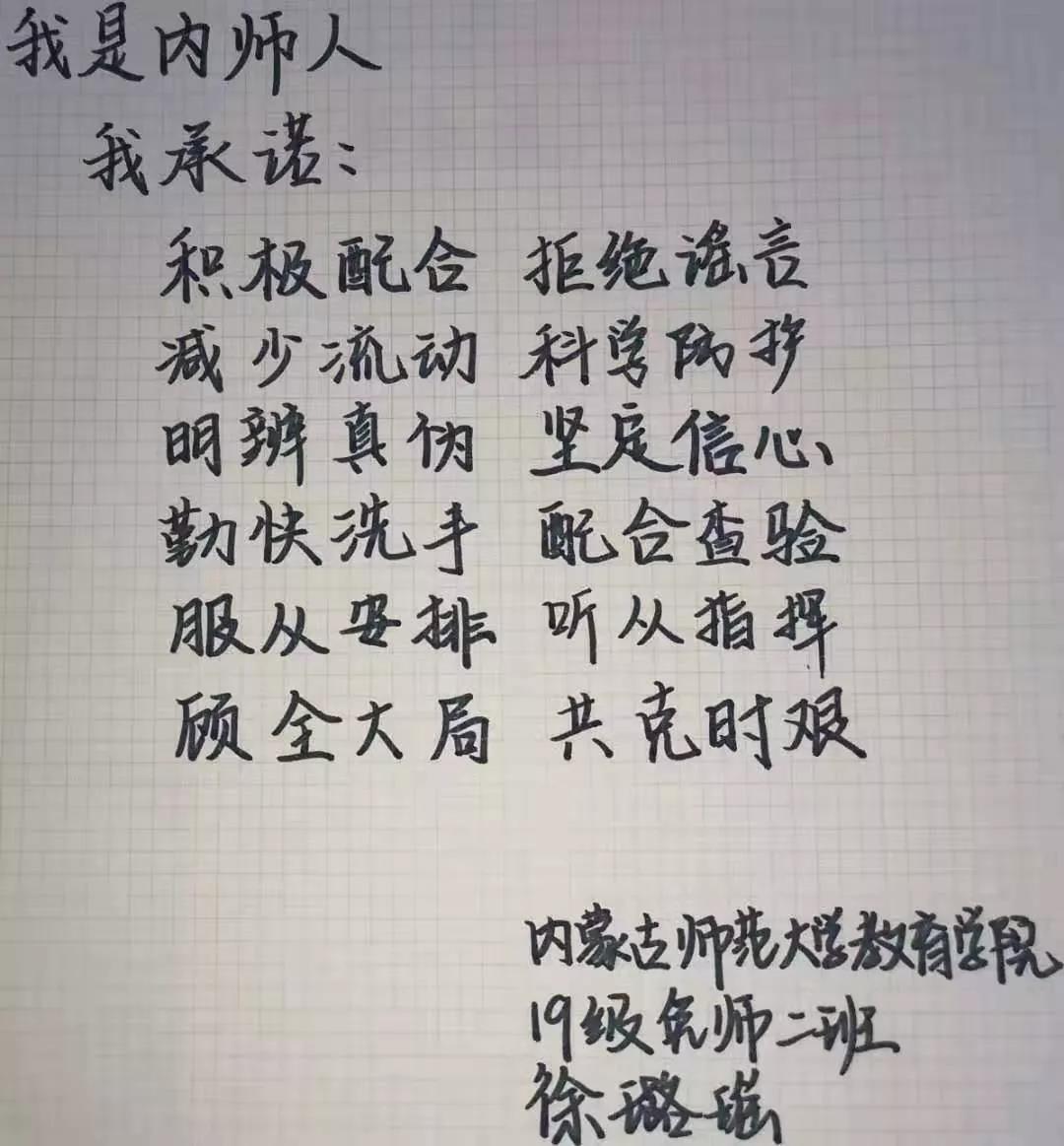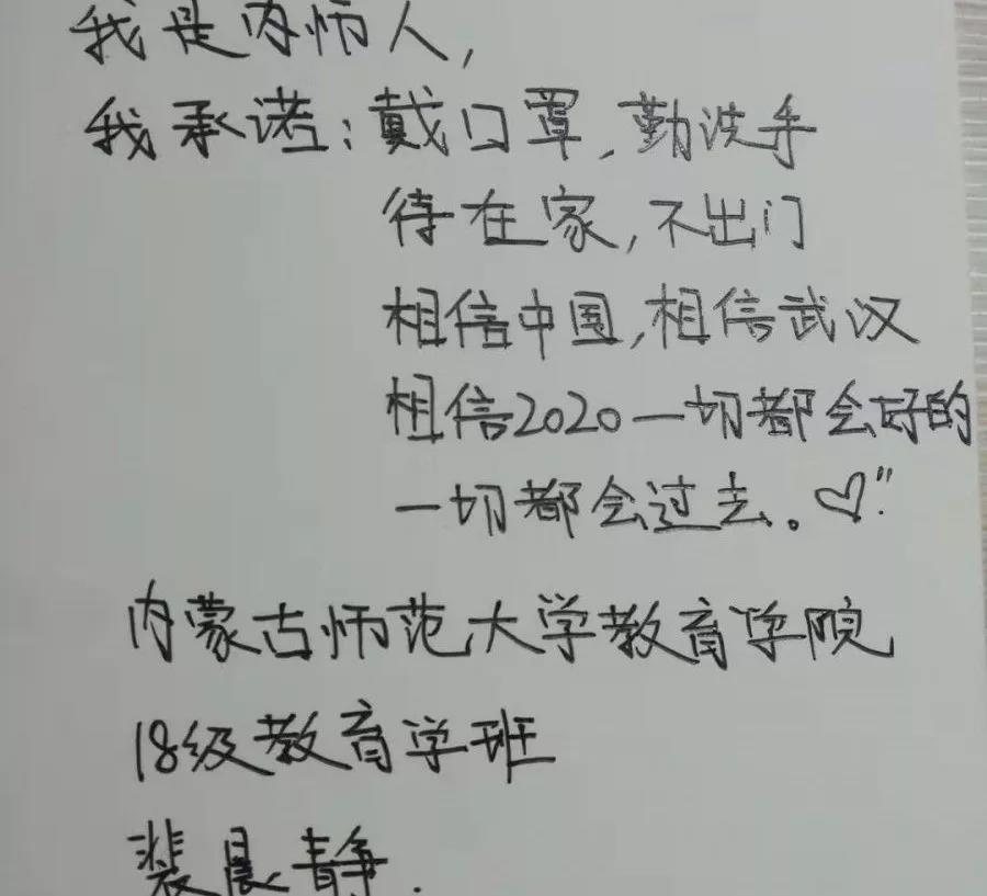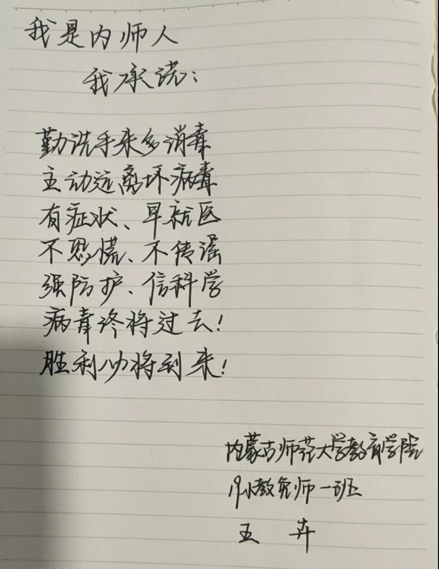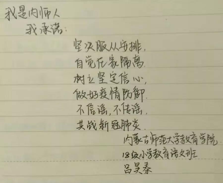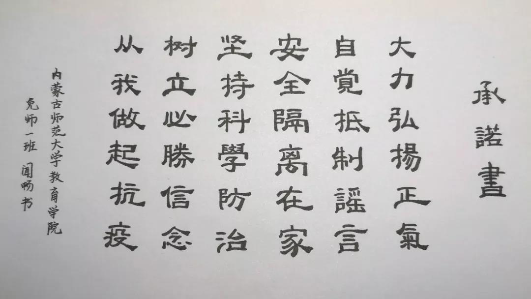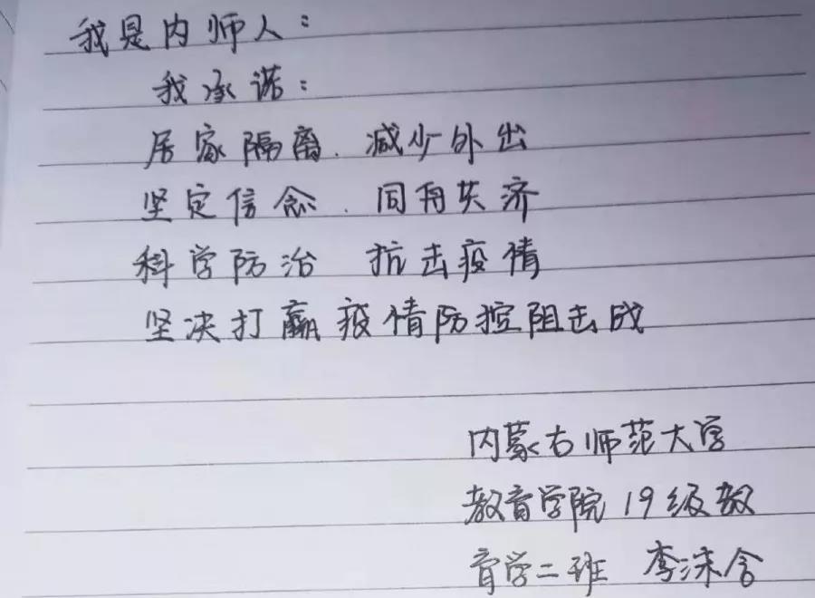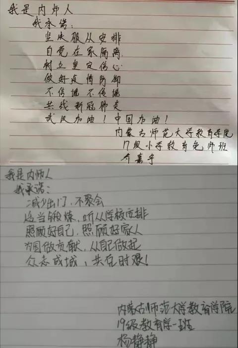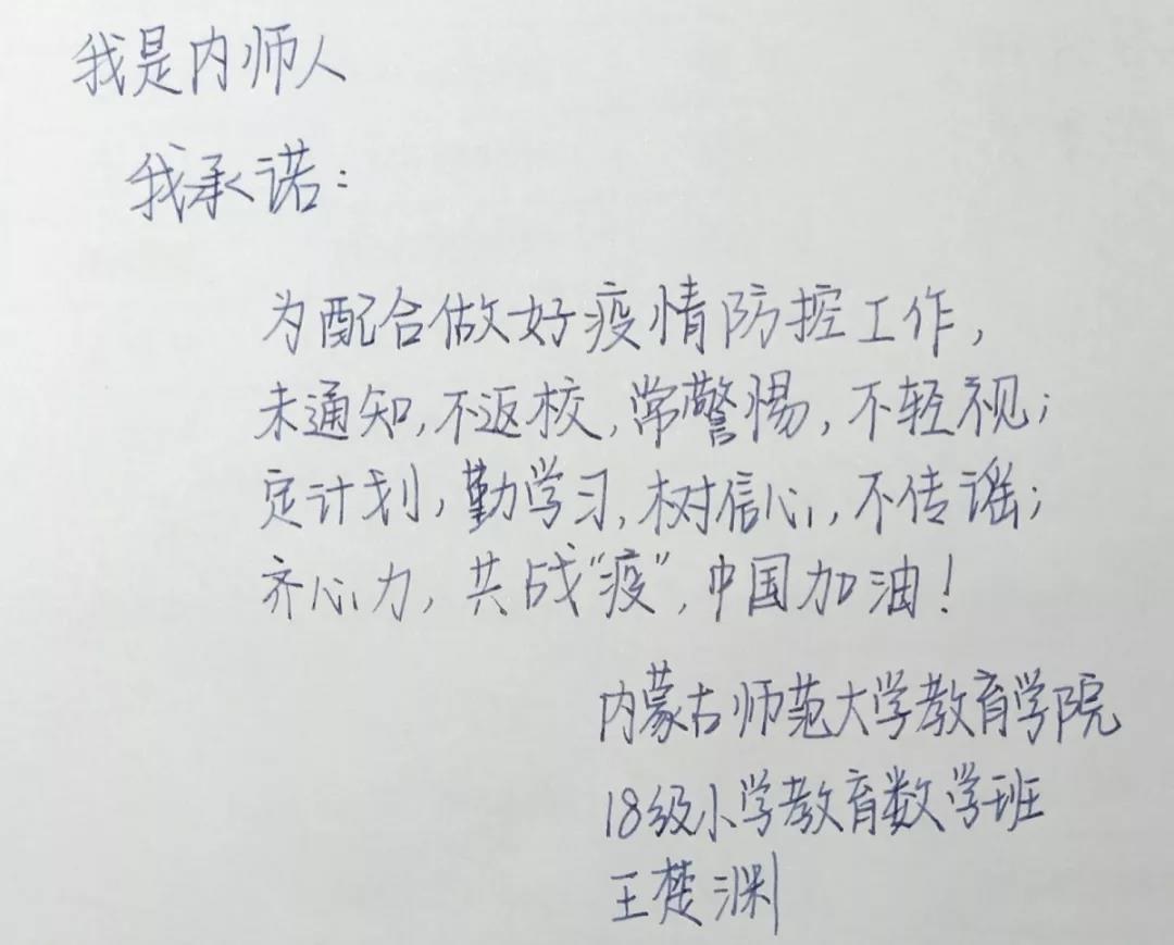 为落实好中央、自治区和m88登录入口官网应对新型冠状病毒感染肺炎相关工作精神,按照共青团中央、自治区团委“关于坚持党的领导,全团动员,在疫情防控阻击战中充分发挥共青团生力军和突击队作用的通知”要求,配合m88登录入口官网团委开展共青团防控疫情“十个一”专题教育活动,引导同学们正确认识疫情,积极应对疫情防控,m88登录入口官网组织开展“防范疫情,从我做起!我是内师人,我承诺!”网络承诺接力活动,发动员工党员、员工干部带领全院员工践行承诺,积极响应号召,服从指挥,保持联络通畅,不提前返校,做到戴口罩、勤洗手,少出门、不聚餐,不信谣、不传谣、不造谣,做运动、不虚度。同学们写下承诺,以笔战“疫”,用实际行动彰显当代大员工的责任与担当,与前线的“逆行者”共同筑起“抗疫”新长城!