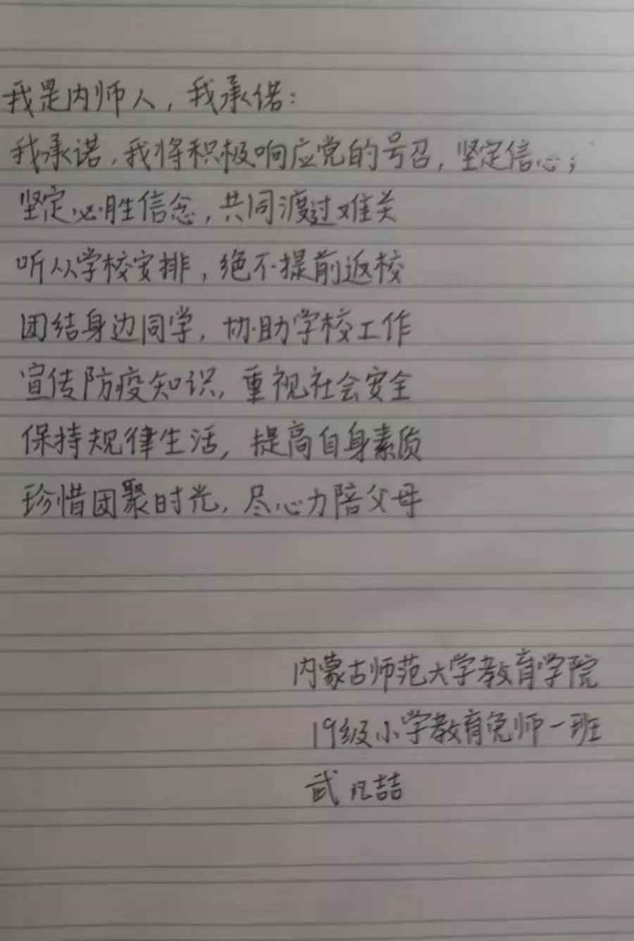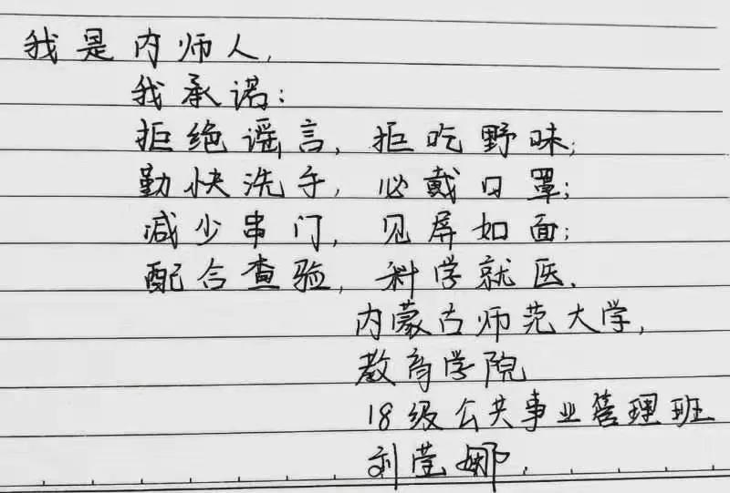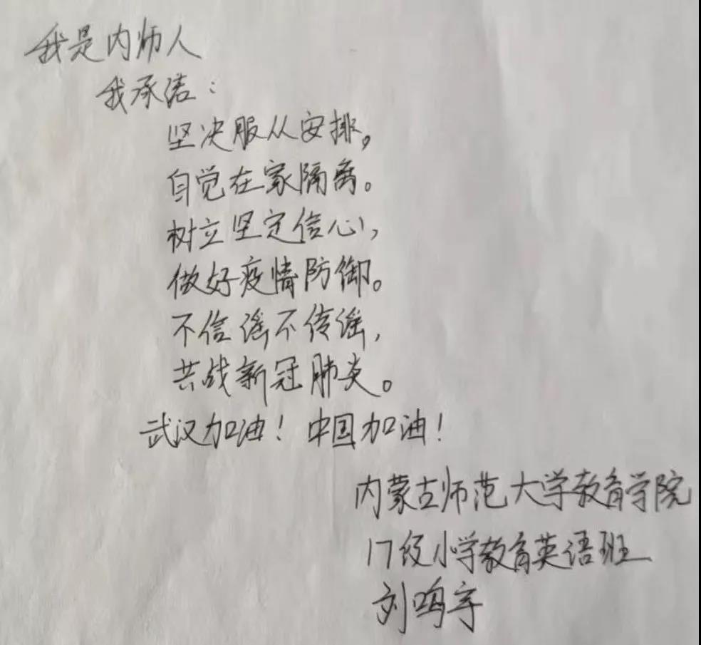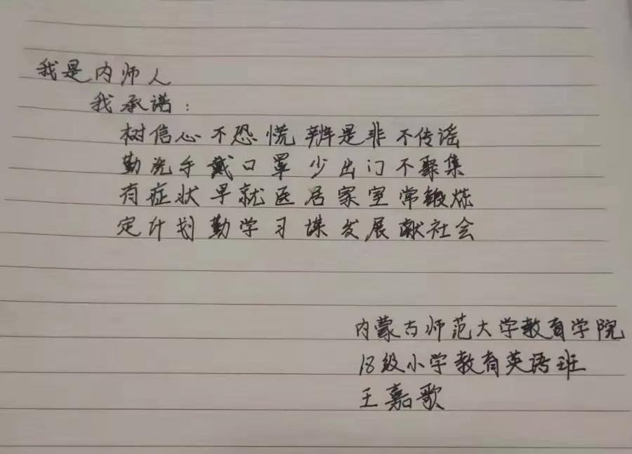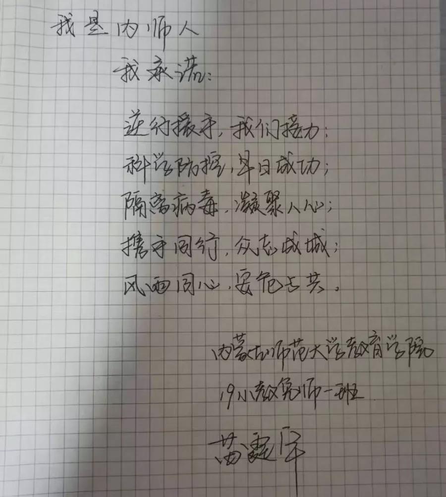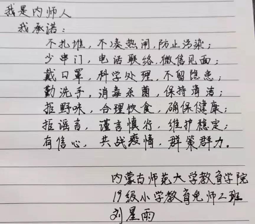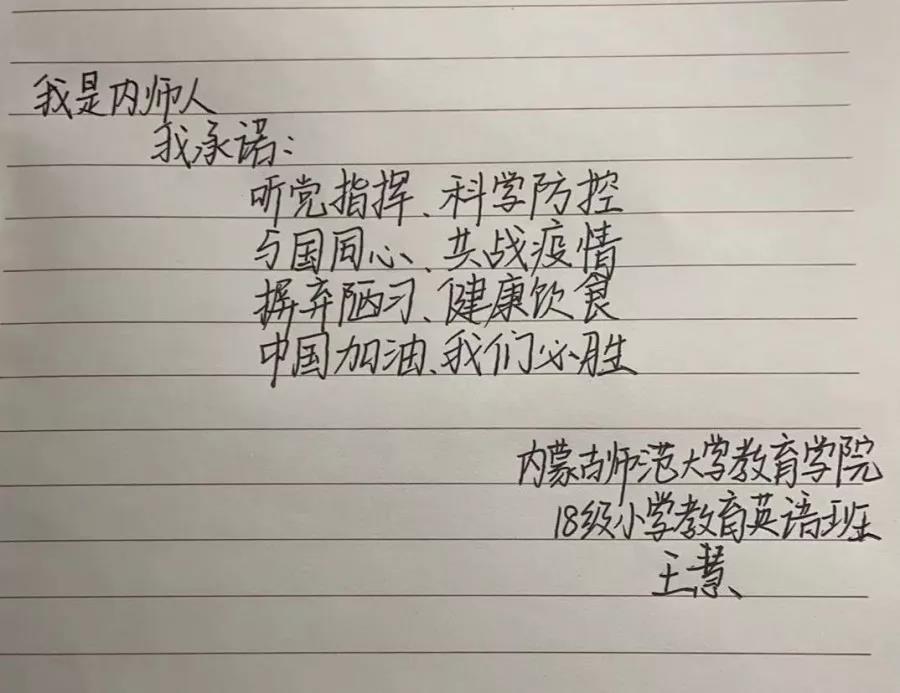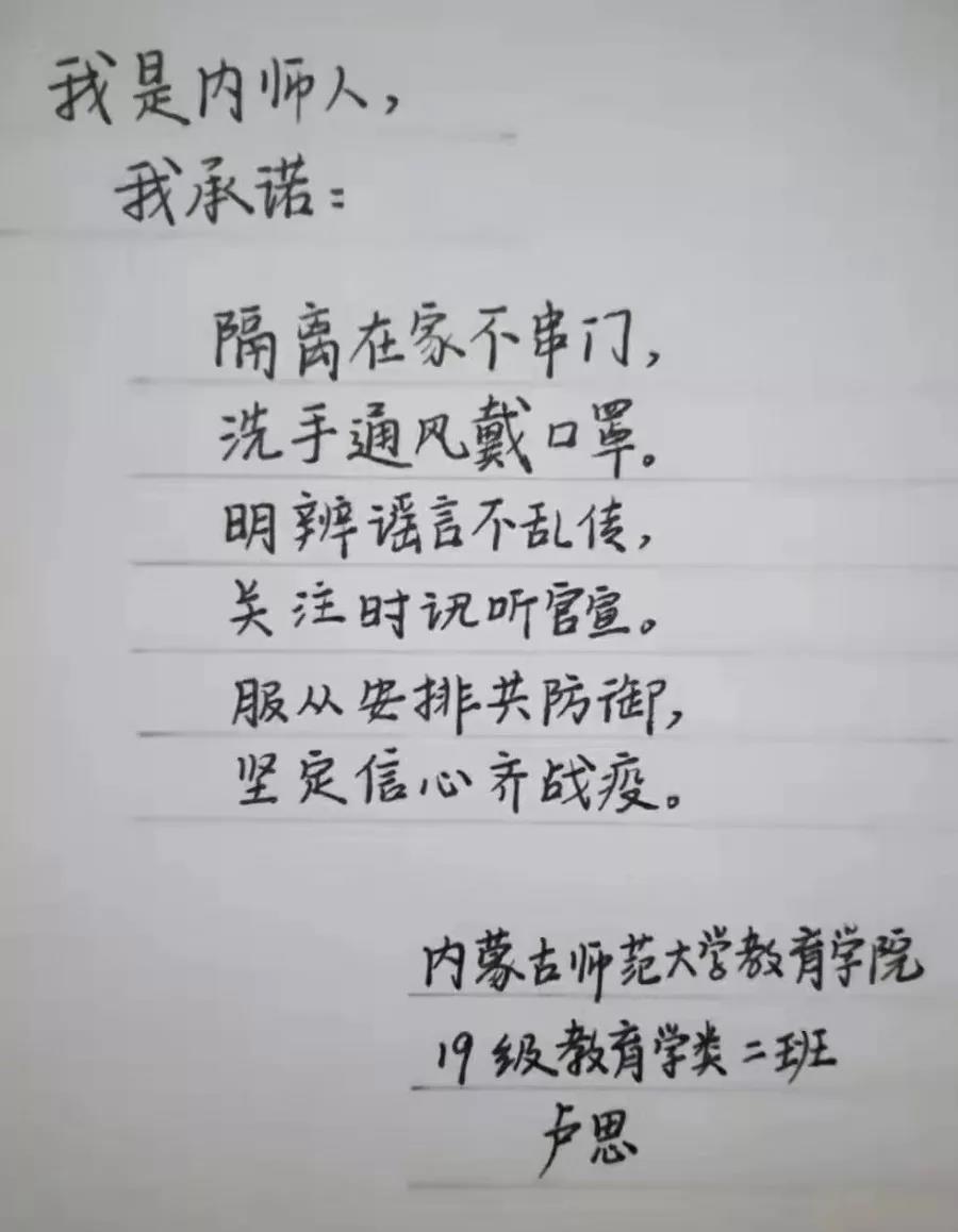 为落实好中央、自治区和m88登录入口官网应对新型冠状病毒感染肺炎相关工作精神,按照共青团中央、自治区团委“关于坚持党的领导,全团动员,在疫情防控阻击战中充分发挥共青团生力军和突击队作用的通知”要求,配合m88登录入口官网团委开展共青团防控疫情“十个一”专题教育活动,引导同学们正确认识疫情,积极应对疫情防控,m88登录入口官网组织开展“防范疫情,从我做起!我是内师人,我承诺!”网络承诺接力活动,发动员工党员、员工干部带领全院员工践行承诺,积极响应号召,服从指挥,保持联络通畅,不提前返校,做到戴口罩、勤洗手,少出门、不聚餐,不信谣、不传谣、不造谣,做运动、不虚度。同学们写下承诺,以笔战“疫”,用实际行动彰显当代大员工的责任与担当,与前线的“逆行者”共同筑起“抗疫”新长城!