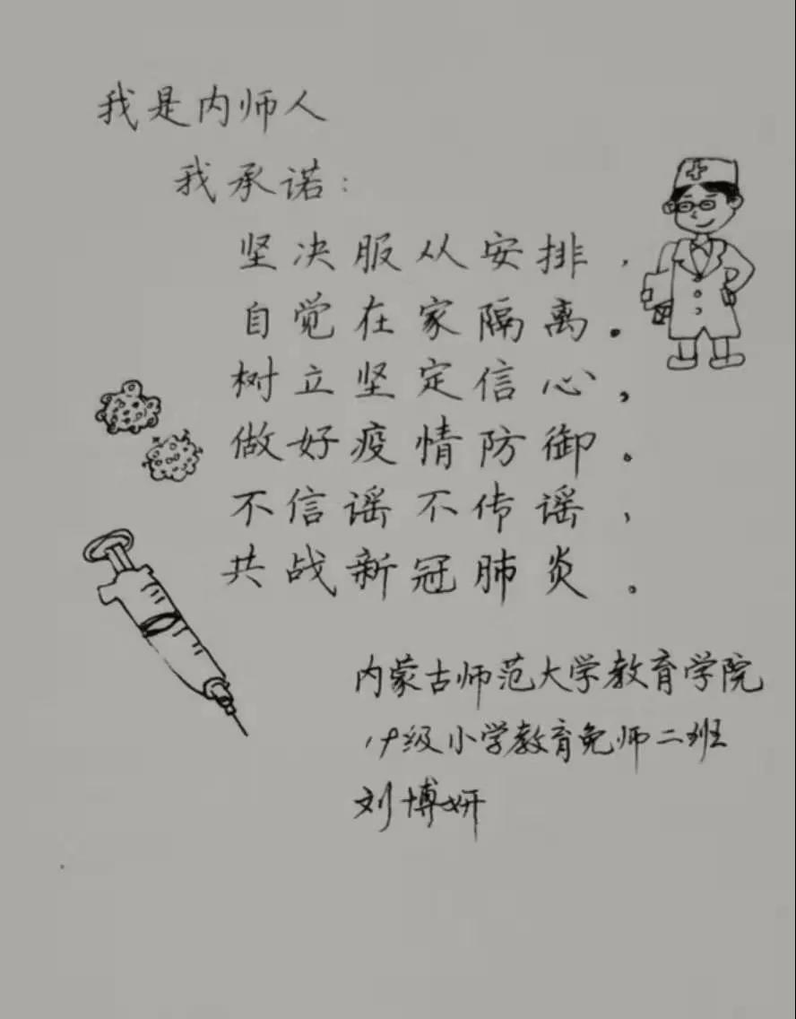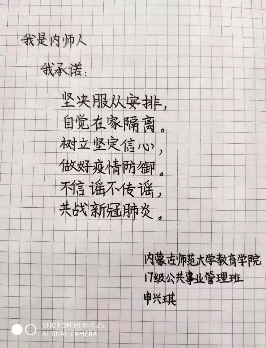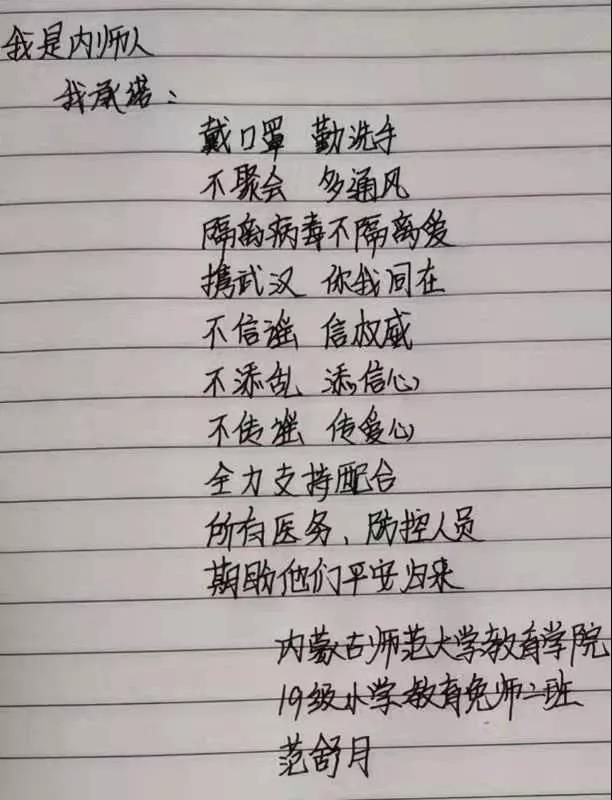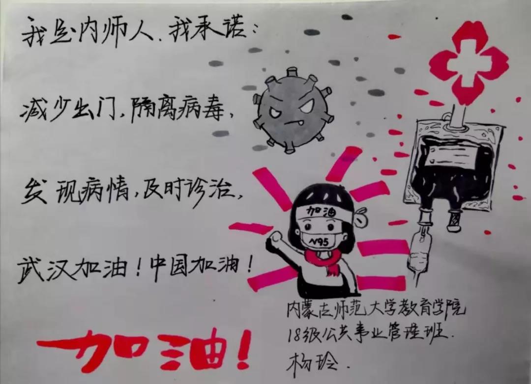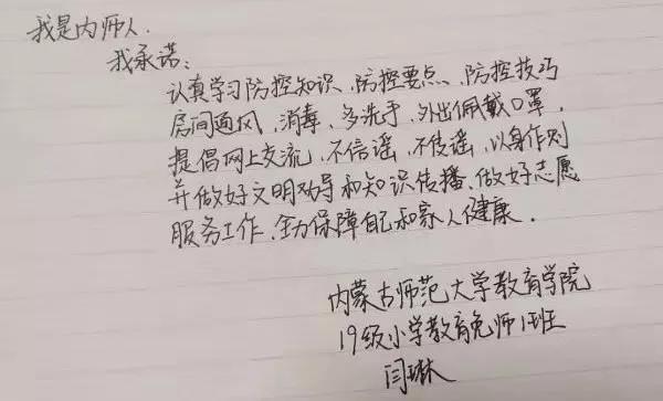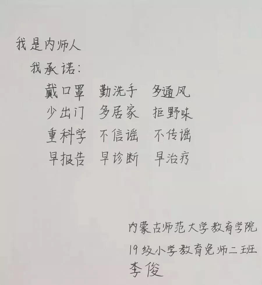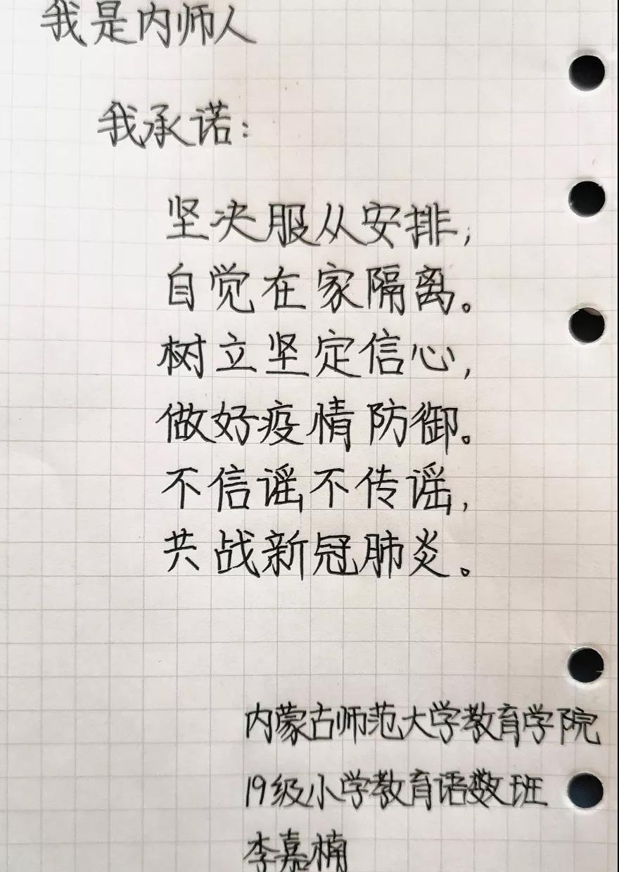 为落实好中央、自治区和m88登录入口官网应对新型冠状病毒感染肺炎相关工作精神,按照共青团中央、自治区团委“关于坚持党的领导,全团动员,在疫情防控阻击战中充分发挥共青团生力军和突击队作用的通知”要求,配合m88登录入口官网团委开展共青团防控疫情“十个一”专题教育活动,引导同学们正确认识疫情,积极应对疫情防控,m88登录入口官网组织开展“防范疫情,从我做起!我是内师人,我承诺!”网络承诺接力活动,发动员工党员、员工干部带领全院员工践行承诺,积极响应号召,服从指挥,保持联络通畅,不提前返校,做到戴口罩、勤洗手,少出门、不聚餐,不信谣、不传谣、不造谣,做运动、不虚度。同学们写下承诺,以笔战“疫”,用实际行动彰显当代大员工的责任与担当,与前线的“逆行者”共同筑起“抗疫”新长城!