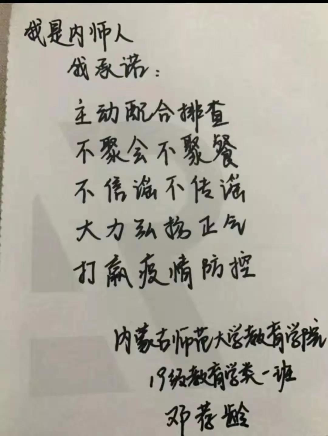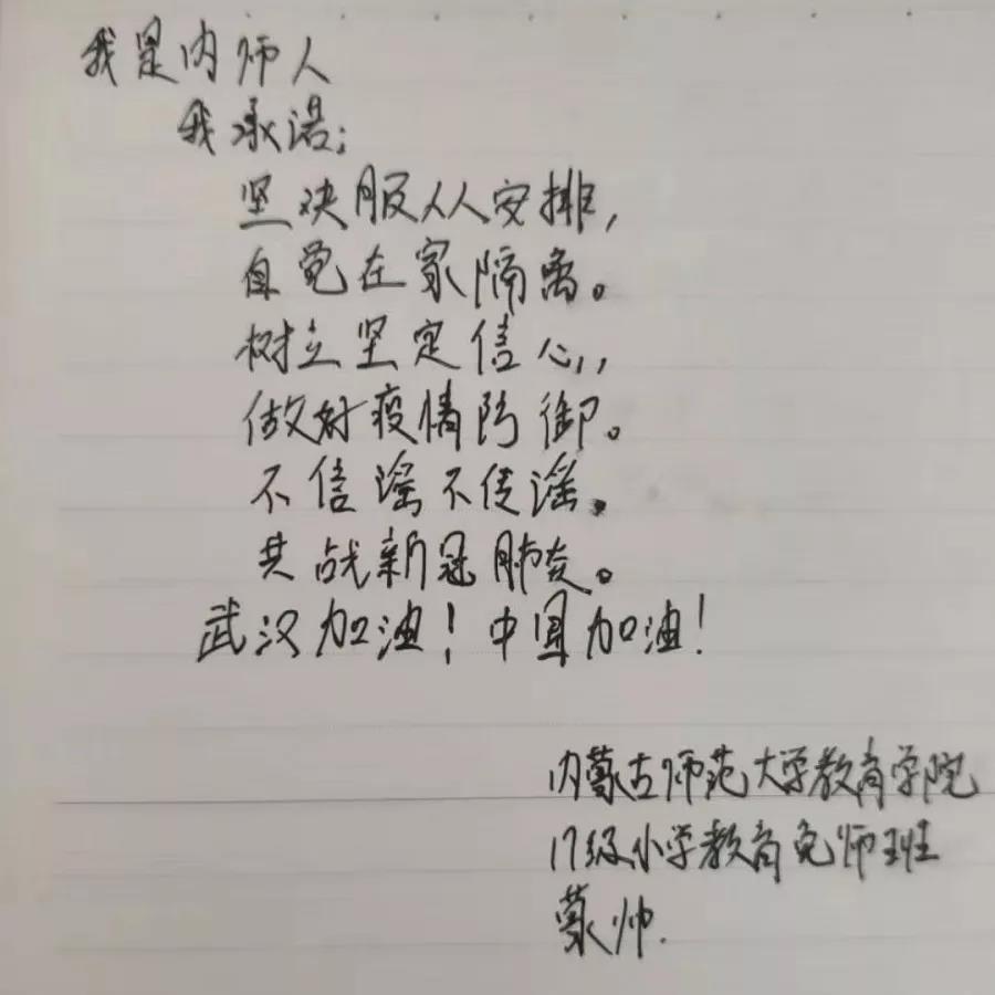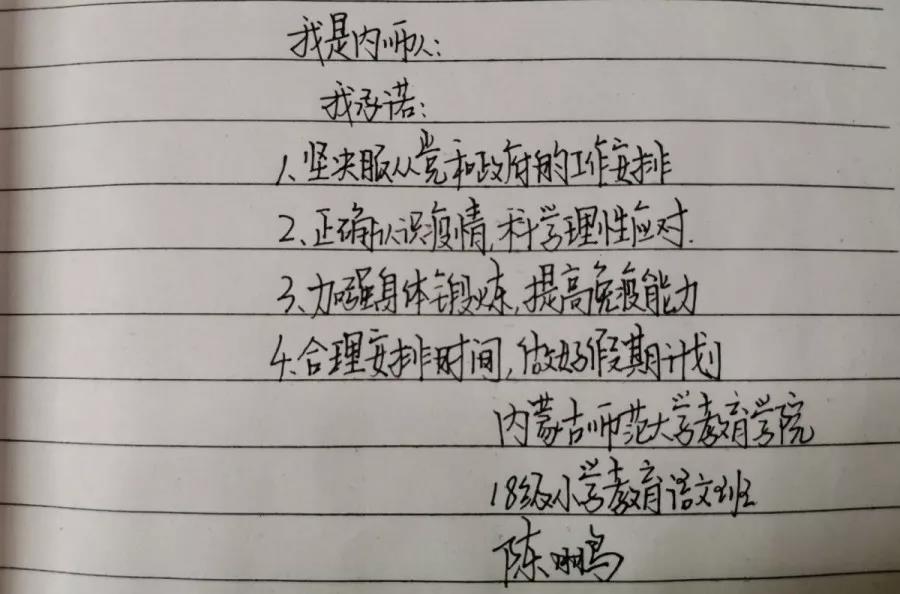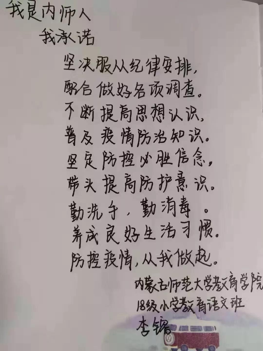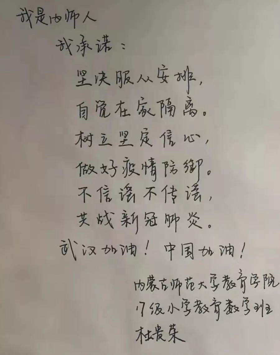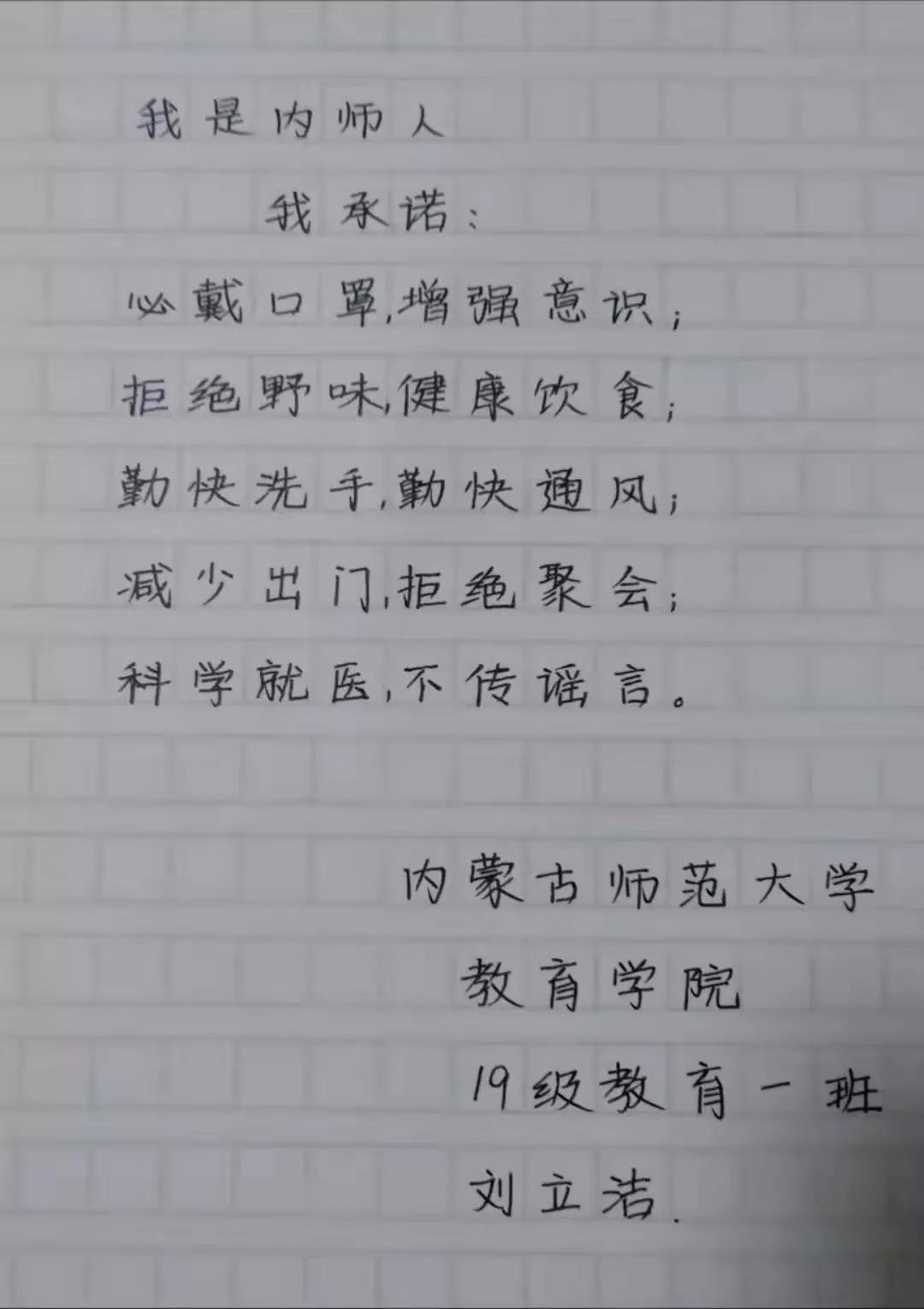 为落实好中央、自治区和m88登录入口官网应对新型冠状病毒感染肺炎相关工作精神,按照共青团中央、自治区团委“关于坚持党的领导,全团动员,在疫情防控阻击战中充分发挥共青团生力军和突击队作用的通知”要求,配合m88登录入口官网团委开展共青团防控疫情“十个一”专题教育活动,引导同学们正确认识疫情,积极应对疫情防控,m88登录入口官网组织开展“防范疫情,从我做起!我是内师人,我承诺!”网络承诺接力活动,发动员工党员、员工干部带领全院员工践行承诺,积极响应号召,服从指挥,保持联络通畅,不提前返校,做到戴口罩、勤洗手,少出门、不聚餐,不信谣、不传谣、不造谣,做运动、不虚度。同学们写下承诺,以笔战“疫”,用实际行动彰显当代大员工的责任与担当,与前线的“逆行者”共同筑起“抗疫”新长城!