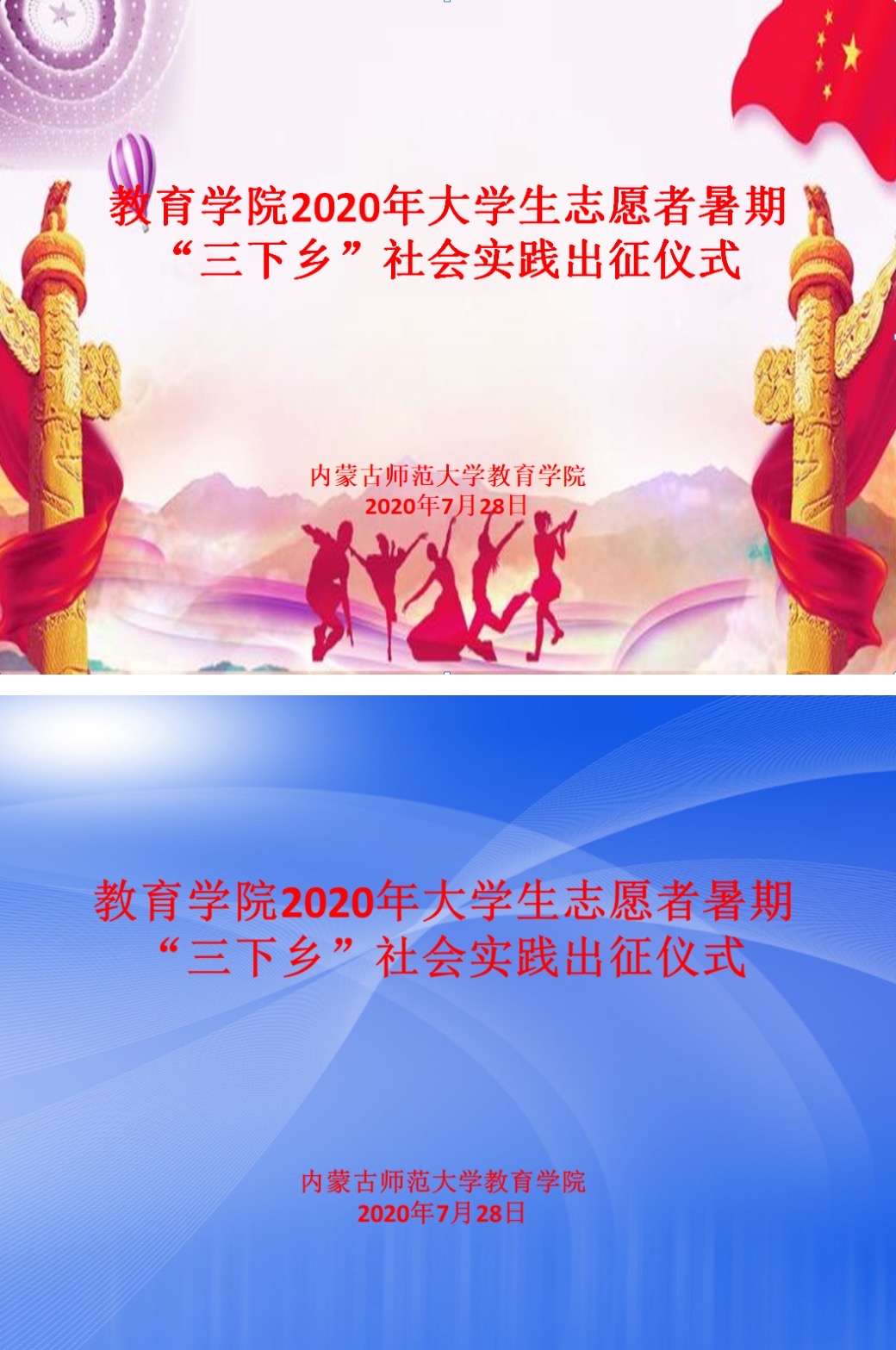 2020年7月28日晚上,m88登录入口官网举办了暑期云端三下乡社会实践活动出征仪式。提前一天,我们信息技术指导组着手制作出征仪式所需定屏。我制作了两版初稿。
