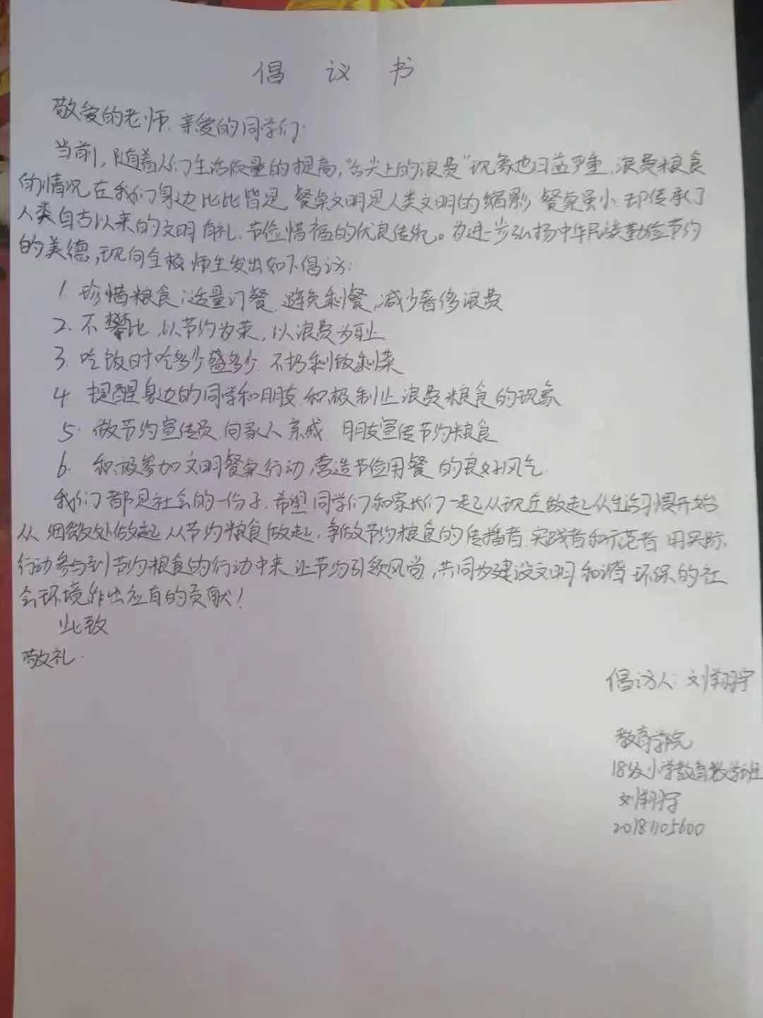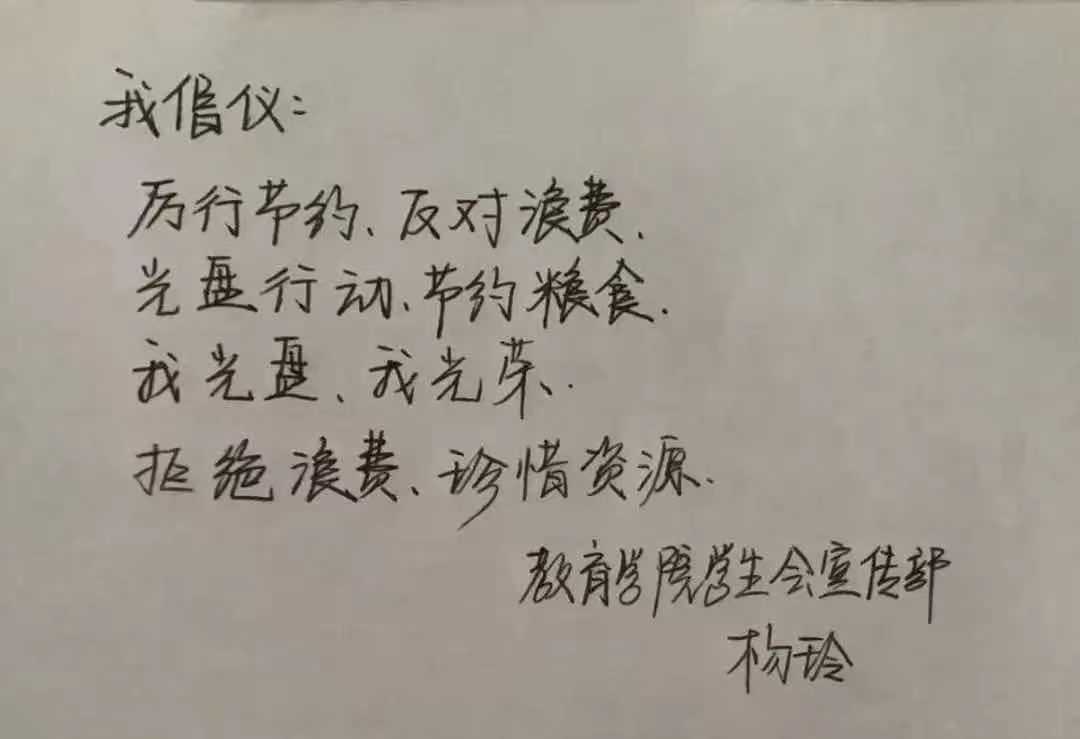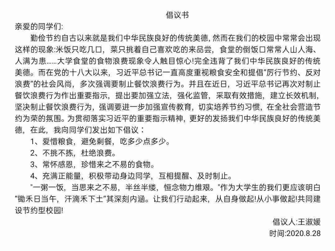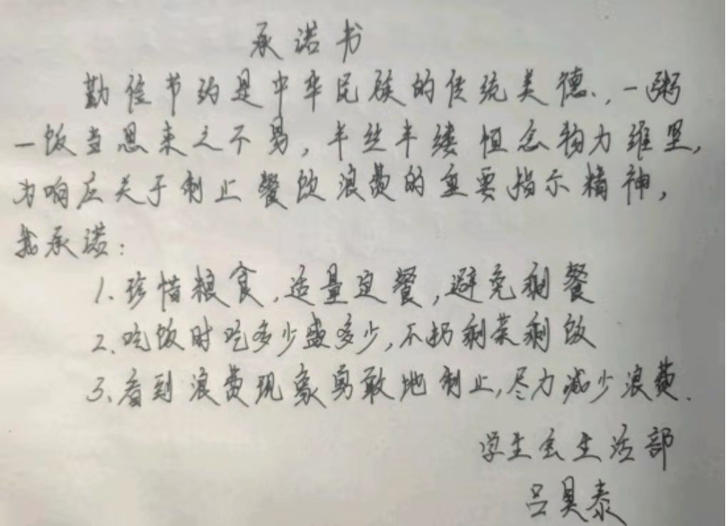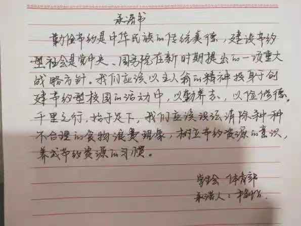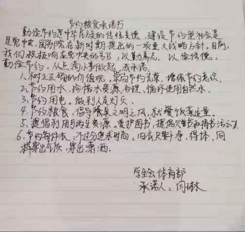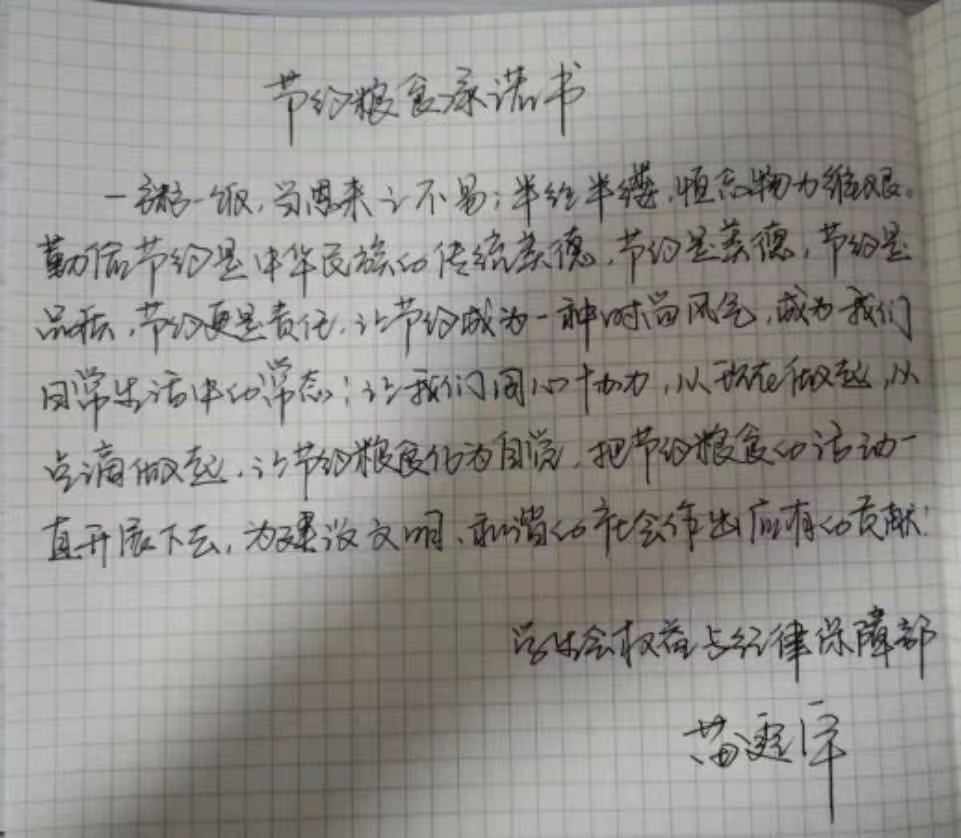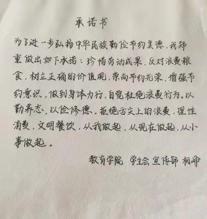 米饭粒粒念汗水,不惜粮食当自悔。谁也不会忘记祖祖辈辈用汗水演绎何处黄土不埋人的壮烈,而如今丰衣足食的我们也绝不能够抛弃艰苦朴素的美德,铺张浪费,为了进一步贯彻落实习近平总书记关于制止餐饮浪费的重要指示精神,m88登录入口官网同学们作出以下承诺: