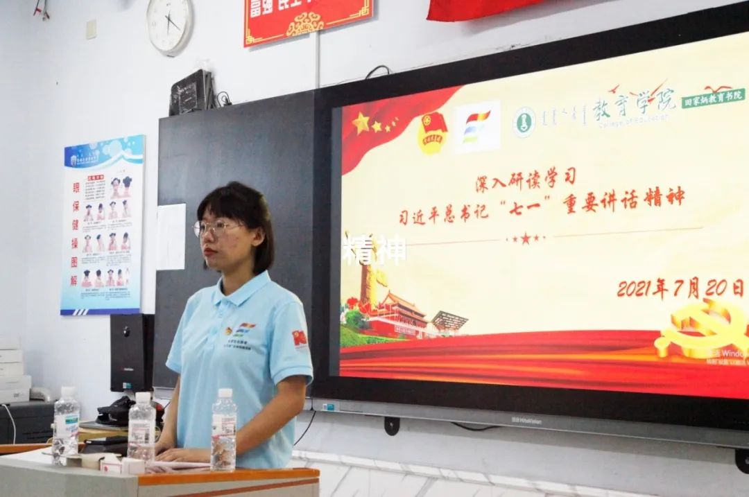 7月20日晚18:30,m88登录入口官网“三下乡”志愿者服务队师生在准格尔旗第九中学综合楼一楼教室深入研读学习习近平总书记“七一”重要讲话精神。