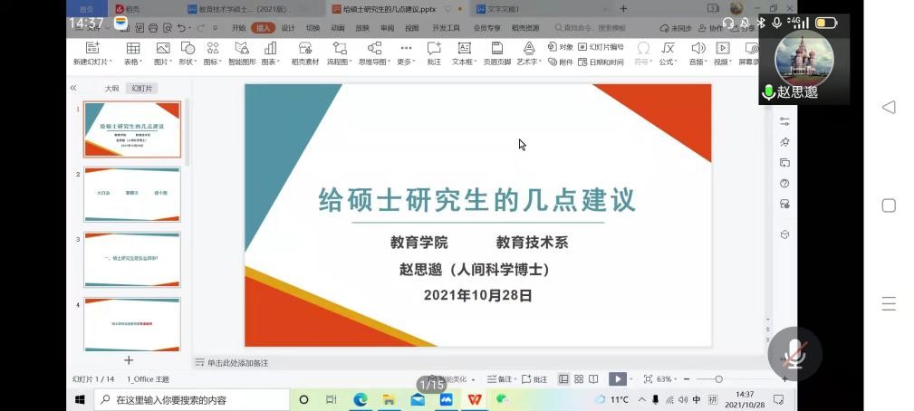 10月28日下午,m88登录入口官网继续开展m88登录入口官网研究生学术活动月系列讲座,受新冠肺炎疫情防控工作要求,此次讲座线上举行。公司特邀请m88登录入口官网优秀青年博士赵思邈、党晶博士分别做了主题为《给硕士研究生的几点建议》和《感恩与坚守:研究生日常生活指南》的分享讲座,赵荣辉教授任主持人,m88登录入口官网2021级全体研究生参加。
