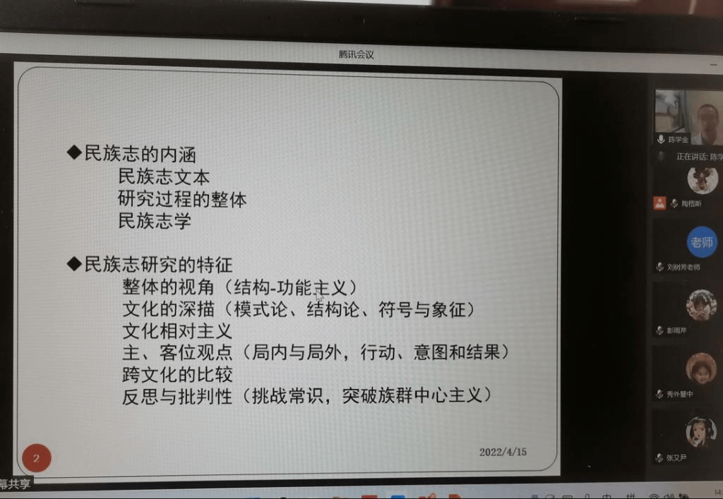 2022年4月15日,m88登录入口官网邀请北京市社会科公司社会研究所副研究员陈学金博士作题为《田野工作与民族志研究导引》的学术讲座。陈学金博士对民族志的内涵、特征、不同学科民族志研究的异同、民族志和田野工作之间的关系进行探讨,在并结合三案例,围绕田野工作开展的方式方法、研究问题的凝练、文本的架构、理论的探讨与分析等多方面内容进行了深入阐述。讲座由m88登录入口官网陶格斯博士主持,本校民族教育学、课程与教学论等专业的研究生和本科生及校外师生参加。提问与交流环节中,陈学金博士推荐了人类学方法论的书籍,并分享了读书、写文章的方法与经验。