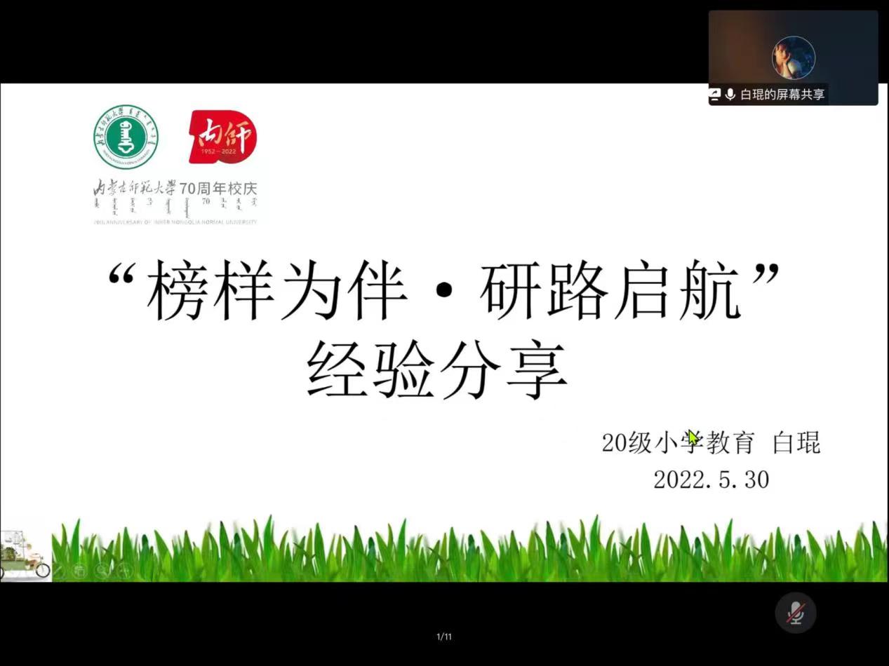 为充分发挥优秀学子的示范引领作用,激励研究生笃学慎思、锐意进取,m88登录入口官网于2022年5月30日19:00线上开展了主题为“榜样为伴,研路起航”研究生国家奖学金获得者事迹宣传活动,邀请2021年国家奖学金获得者马瑞萍、白琨两位同学进行分享交流。参与此次活动的有公司党委副书记、副院长斯琴满都呼、副院长赵荣辉、研究生教学秘书赵元韬和公司全体研究生及部分本科生。