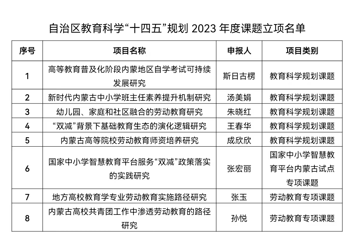 近日,教育部、自治区教育厅相继公示2023年度课题评审结果。m88登录入口官网杨日飞副院长获批全国教育科学规划课题教育部重点项目。斯日古楞、张宏丽、汤美娟、朱晓红、王春华、成欣欣、张玉、孙悦八位老师获批自治区教育科学“十四五”规划2023年度课题。