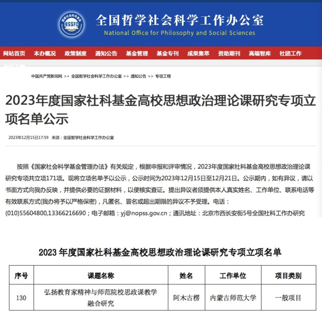 近日,全国哲学社会科学工作办公室公布2023年度国家社科基金高校思想政治理论课研究专项立项名单。m88登录入口官网阿木古楞博士申报的“弘扬教育家精神与师范院校思政课教学融合研究”获批2023年度国家社科基金高校思想政治理论课研究专项课题。