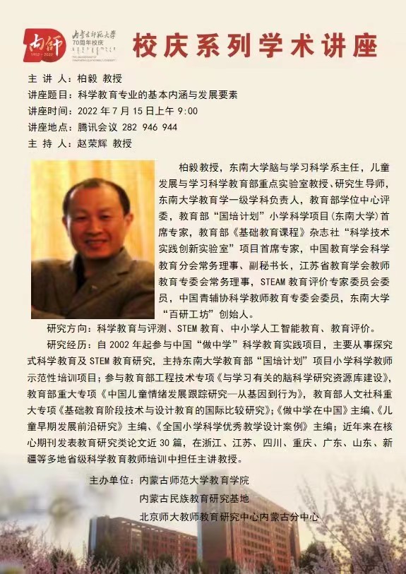 7月15日上午,m88登录入口官网邀请东南大学脑与学习科学系主任柏毅教授,为m88登录入口官网全体师生通过腾讯视频会议,做了题为“教育科学专业的基本内涵与发展要求”的学术报告。报告由m88登录入口官网、内蒙古民族教育基地、北师大员工教育研究中心内蒙古分中心主办,赵荣辉副院长主持,小学教育专业300多位师生聆听了报告。